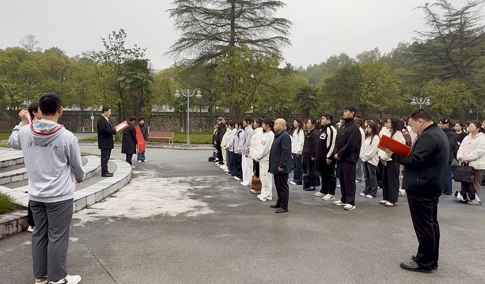 “守护一库碧水,我们准备好了!”出征仪式上,全体师生重温了习近平总书记给湖北十堰丹江口库区环保志愿者的回信。丹江口校区管委会常务副主任腊国庆在致辞中强调,全体师生要通过此次研学,深刻领悟爱国主义、“南水北调精神”和“抗洪精神”的深刻内涵,将端正入党动机与守水护水使命紧密结合。随后,全体成员进行了集体宣誓,“勇担政治使命,扛牢政治责任,为确保一泓清水永续北送而努力奋斗!”铿锵誓言回荡在校区上空,彰显了师生们守护清水北送的政治自觉和行动决心。