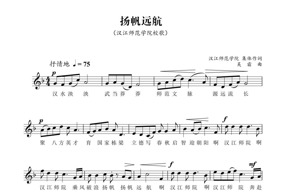 博鱼体育登录校歌歌词《扬帆远航》为集体创作,集中体现了汉师的历史底蕴、地域特色和时代风采,将校训“立德、启智、修能、笃行”融入其中,激励师生弘扬传承环球360会员登录精神,努力培养人才,追逐梦想,扬帆远航。校歌谱曲由武汉音乐诺亚体育app官网吴霜教授团队创作,国际首席爱乐乐团配器,北京首席合唱团演唱。歌曲旋律优美抒情,融合地方民歌的通俗和现代音乐的流行元素,展现了博鱼体育登录师生员工团结奋进、锐意进取、昂扬向上的精神风貌。